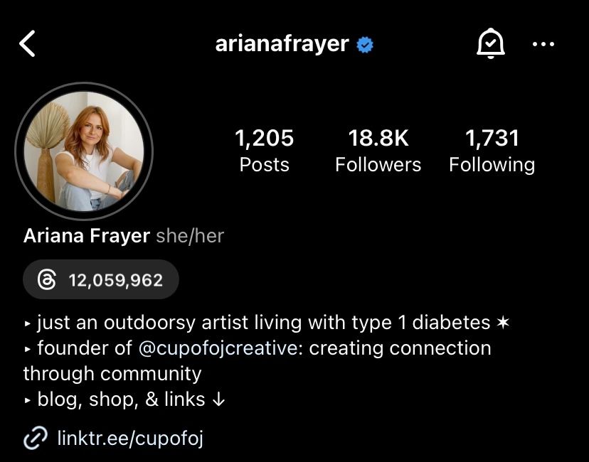 Ariana Frayer has been a favorite for us because she is the embodiment of “I am more than my condition.” She is an avid hiker who also runs her own small business, Cup of OJ. She posts about her day to day life, and is honest about the challenges while also sharing the wins that come along with this diagnosis. She has had Type One since childhood but still experiences new things with her management. Just recently she started using an Omnipod after being MDI (Multiple Daily Injections) for years. When we first received our diagnosis we were worried about my child’s future and what that would look like. Will they be able to go on adventures? Will they get to experience all that life has to offer? Will they have a happy life? Ariana has shown us that all of this is possible and then some! She also recently became a mom! She is such a bright light in the Diabetes community!