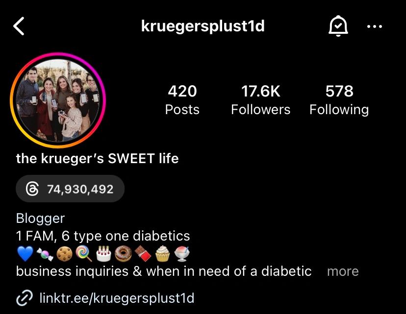 KreugersPlusT1D is an amazing page to follow. This family has six members with Type One Diabetes so you get to see just how different management is for everyone. Each member of the family has a unique diagnosis story as well as their choice of CGM and insulin delivery. I love this page because it really drives home that Type One is not one size fits all.
